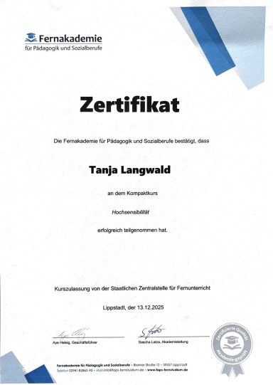 Zudem habe ich mir durch meinen eigenen Sohn in den letzten Jahren ein großes Fachwissen zu dem komplexem Thema "Hochsensibilität" angeeignet, um ihn und auch uns als Familie immer besser unterstützen zu können. Dadurch wurde ich dann auch auf meine eigene Hochsensibilität aufmerksam, die mich heute noch viel mehr verstehen lässt und weitere Fortbildungen ergaben immer mehr "Aha-Erlebnisse".